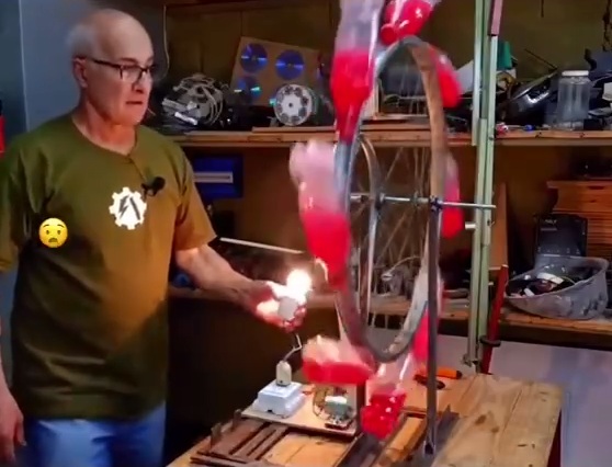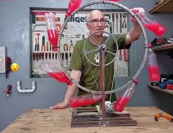 20.1.2024: Perpetuum Mobile mit Velorad, 8 Flaschen schräg dran, Riemen, Transformator - ist FAKE