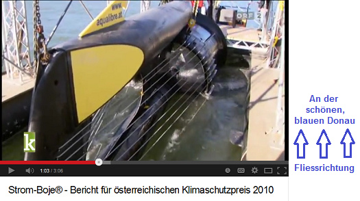 Mit 500 Strombojen könnte die ganze Region "Wachau" mit Strom versorgt werden und eine Autarkie für 35.000 Haushalte beim Strom erreicht werden (1'0-33''). Die Bojen überstehen alle Hochwasser, auch wenn alle anderen Kraftwerke bereits abgestellt werden müssen (1'35-48''). Auch 4 Meter pro Sekunde [14,4 km/h] sind kein Problem (1'50''-2'12''). Die Boje passt sich dem Pegelstand an, statt den Pegelstand zu verändern. Fische und Schwimmer können sich an der Boje nicht verletzen, wurde alles getestet. Die Unsichtbarkeit der Boje kommt bei der Bevölkerung gut an, und sogar die Fischer sind zufrieden, dass die Fische keinen Schaden nehmen (2'12-51''). 2010 stand noch eine grössere Boje und ein höherer Wirkungsgrad auf dem Plan. Das Prinzip ist simpel und einfach: "Aussetzen - verankern - anstecken. Und schon gibt's reinen Ökostrom." (2'51''-3'6'').