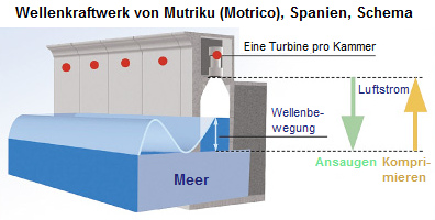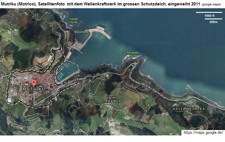 Mutriku, der Hafen, die Molen und ein grosser Schutzdeich mit einem grossen, integriertem Wellenkraftwerk - 970 MWh pro Jahr -- die Technik -- Prototypen -- Funktionsweise mit senkrecht eingebauten Turbinen -- viel Wellenenergie im Winter, weniger im Sommer -- Luftkammern -- 600 kWh pro Jahr, 2,7 Millionen Euro -- Euskadi, Nereida -- Molenbauten -- Planung und Daten -- Bau der Luft-Wellen-Kammern (Druckluftkammern) -- Bau der Turbinenhalle -- Details