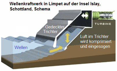 [11] Wellenkraftwerk in Limpet auf der Insel Islay in Schottland, Schema: http://brageconsultores.blogspot.com/2009/04/planta-de-energia-maritima-en-motrico.html
