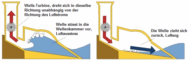 Wenn eine Welle die Luftkammer erreicht, steigt der Wasserspiegel an und drückt die Luft nach oben durch die Turbine. Geht die Welle zurück, zieht der fallende Wasserspiegel die Luft nach unten und bewegt ebenfalls die Turbine. Die Turbinen bleiben dabei immer in derselben Richtung in Bewegung.