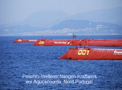[3] Pelamis-Wellenkraftwerk mit drei Pelamis (Wellenschlange) vor Porto in Portugal: http://www.youtube.com/watch?v=fet4bCYvmLw, 11sek.