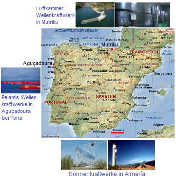 [5] Karte von Spanien und Portugal mit Almeria (Sonnenkraftwerke), Aguçadoura (Pelamis-Park) und Mutriku (Kammer-Wellenkraftwerk):