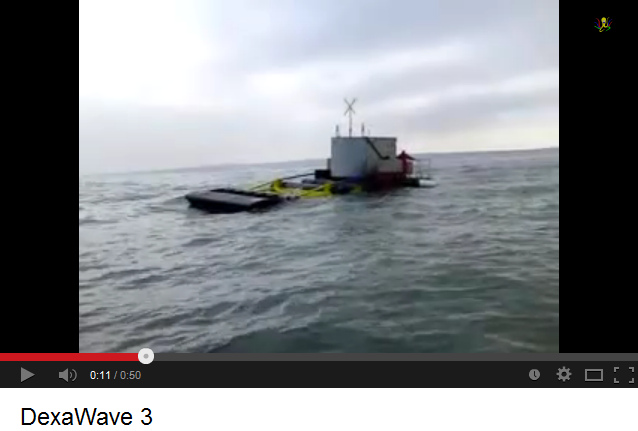 Dexa Wave ist ein kleines "Schiff" mit einem Gelenk in der Mitte und einer kleinen Trafostation oben drauf, das sich dem Wellengang anpasst. Dexa Wave stammt aus Holstebro, Dänemark (DEXAWAVE A/S - Enghaven 49 - DK-7500 Holstebro - +45 8651 8690 - E-Mail: info@dexawave.com - http://www.dexawave.com) [web16].