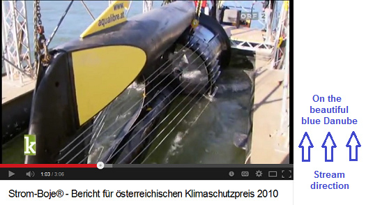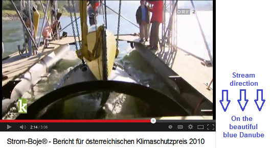 Such a stream buoy was installed in the Danube before Vienna in the region of "Wachau". During the flood of the Danube of 2010 in the Wachau a new world record was set: Translation: <The world record for hydropower in free flow of 3 kW /m² was far exceeded: on 10 kW /m² rotor area at 3m/s [10.8 km/h].> [web10].