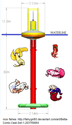 The power buoy on the first photo is still relatively small: height between 5.6-9m, height out of the water 1.7m, draft 7.4m, average wave height difference 1.5m, weight 2140kg [web06].