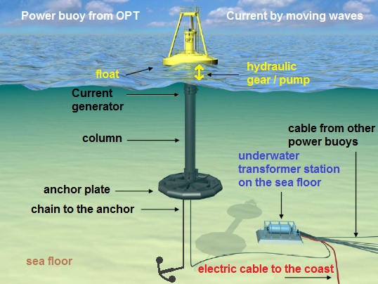 [8] Power-Boje mit Anker und Unterwasser-Trafostation, Schema: http://jagadees.wordpress.com/2010/04/24/powerbuoy/