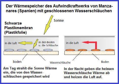 Für ein sicheres Aufwindkraftwerk legt man das Rohr an einen Berghang, überspannt den Warmwasserspeicher mit transparenter Plastikmembran (dicke Folie) und sichert die Röhre in regelmässigen Abständen mit Speichenrädern, damit sie vom Luftzug nicht oval wird und Risse bekommt. Der Warmwasserspeicher besteht aus geschlossenen Wasserschläuchen, die die Wärme 5mal mehr speichern als die Erde.