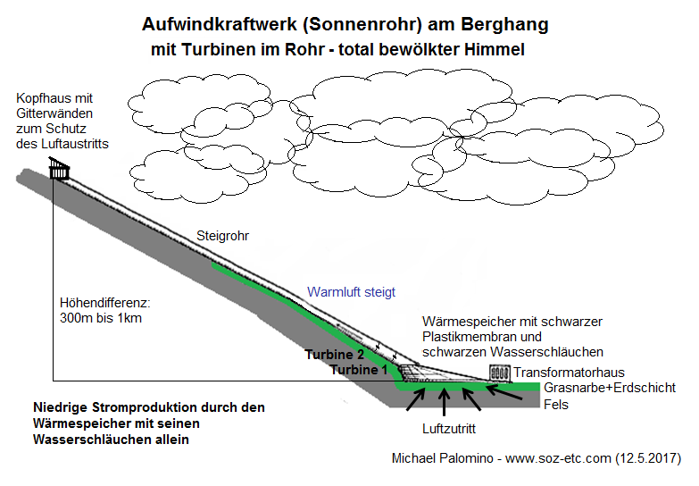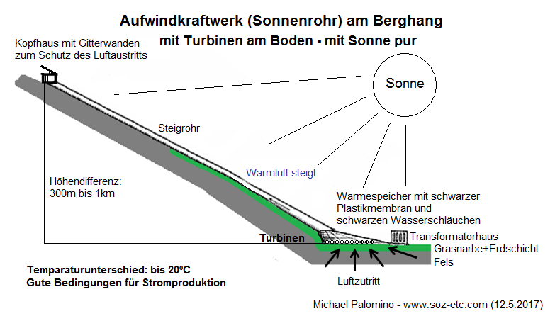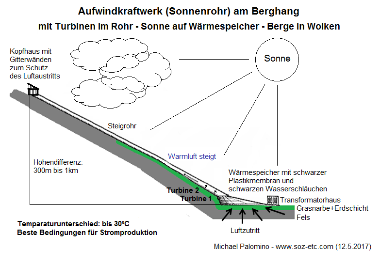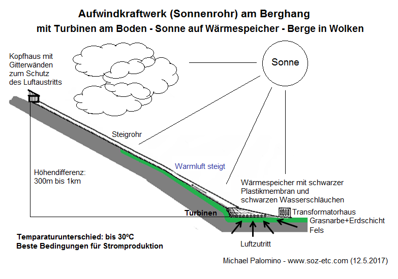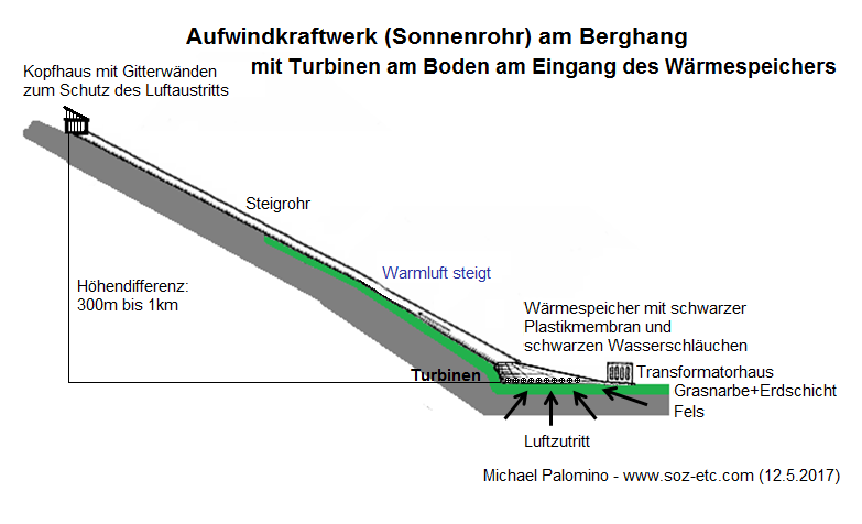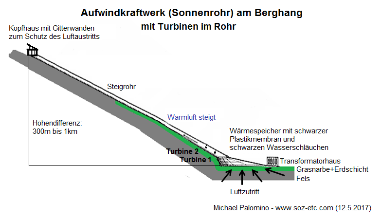 Die Idee eines Aufwindkraftwerks mit einer Röhre am Berghang wurde bis heute (2017) NIE REALISIERT.