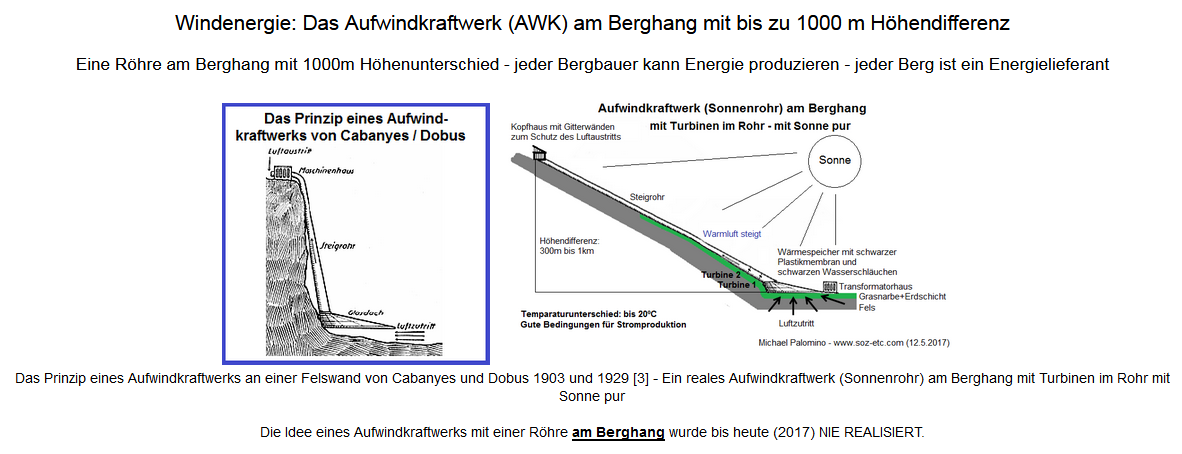 Mit Aufwindröhren kann jedes Bergtal zu einem "Strom-Tal" werden. Vertreter von der ETH (Link) behaupten immer, die Aufwindröhre würde nicht rentieren. Komisch ist aber, dass die Aufwindröhre nur vertikal in Spanien ausprobiert wurde, aber noch NIE an einem Berghang ausprobiert wurde (!).