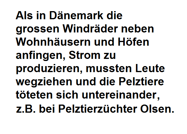 Als in Dänemark die grossen Windräder neben Wohnhäusern und Höfen anfingen, Strom zu produzieren, mussten Leute wegziehen und die Pelztiere töteten sich untereinander, z.B. bei Pelztierzüchter Olsen. [2a]