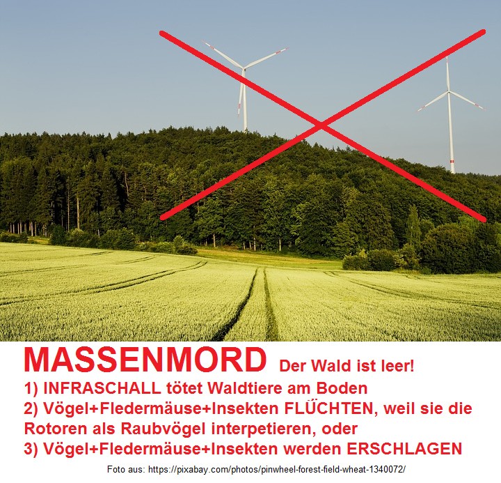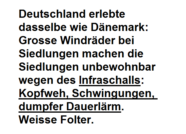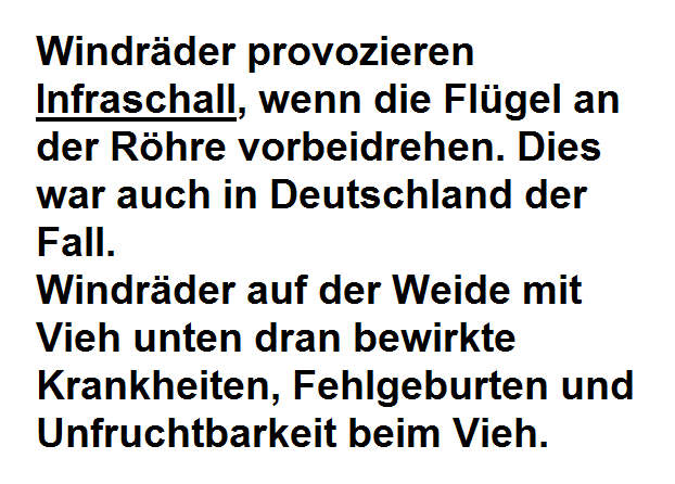 -- Windräder provozieren Infraschall und töten damit Tiere, Vieh und vertreiben die Bewohner wegen Kopfweh und dumpfem Dauerlärm