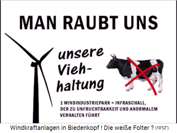 Windräder auf der Weide mit Vieh unten dran bewirkte Krankheiten, Fehlgeburten und Unfruchtbarkeit beim Vieh. [3a]