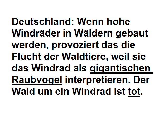 -- im Wald wird der Wald zerstört und es fliehen die Waldtiere, weil sie das grosse Windrad als Raubvogel wahrnehmen