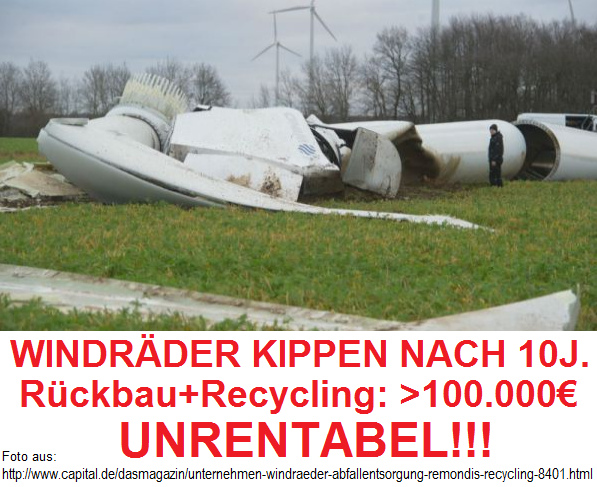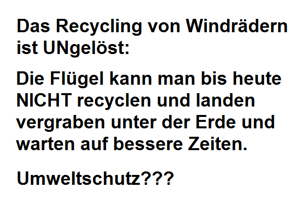 -- die Flügel sind ohne Recycling, sie werden einfach vergraben - und die Firmen verweigern auch den Rückbau, es bleiben Windradruinen oder Stummel z.T. ohne Flügel