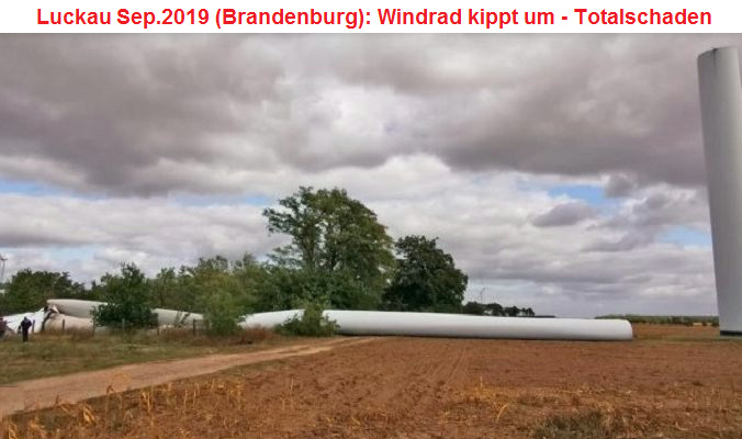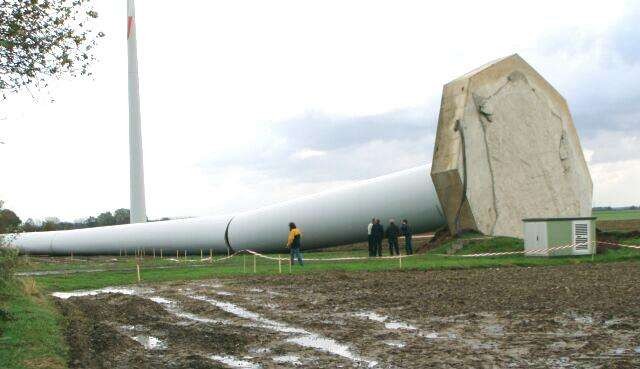 -- die Vibration im Boden ist bei Betrieb sehr stark und die Wasseradern können sich verändern, so kann sich das Fundament destabilisieren und fertig aus bums kippt das Windrad (Foto von einem gekippten Giga-Windrad)