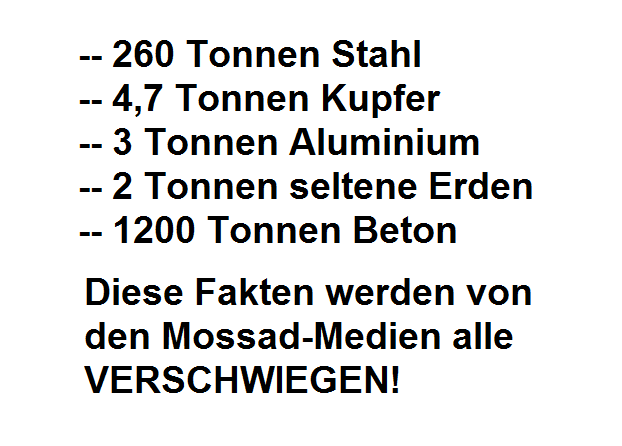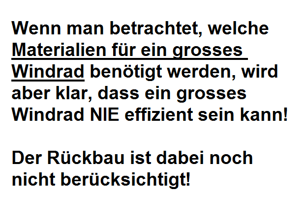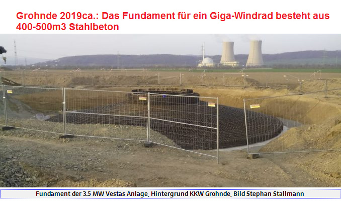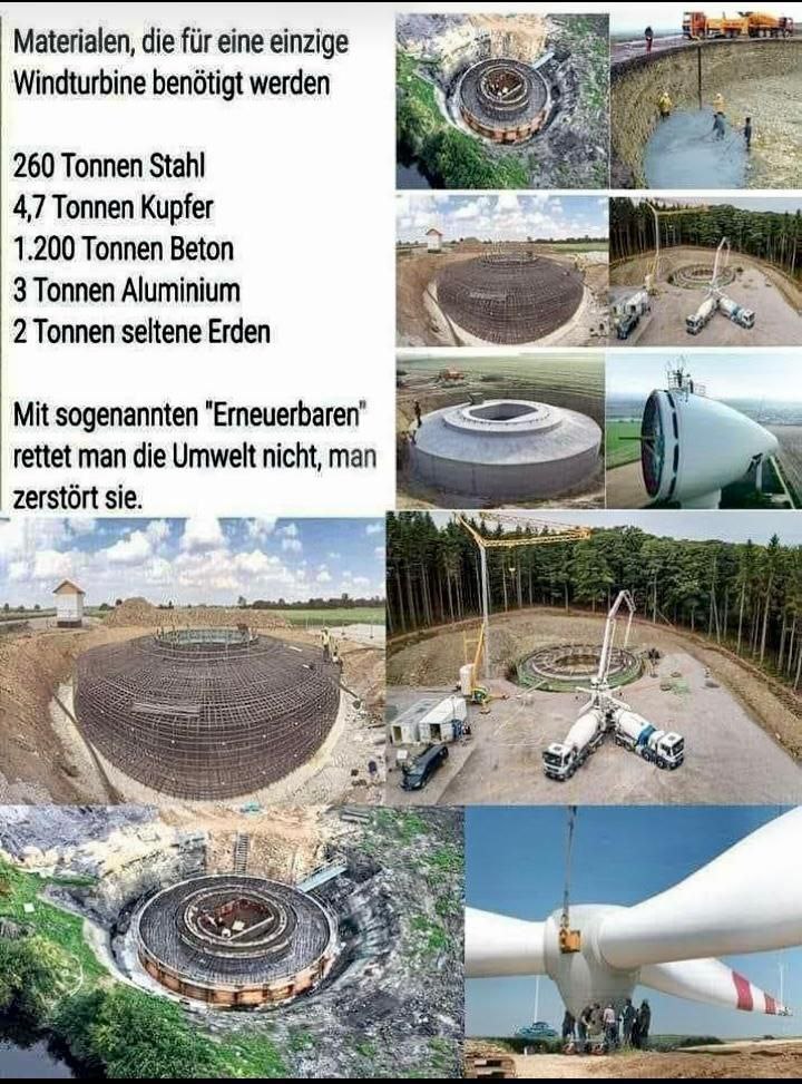 -- allein das Fundament braucht 400-500m3 Stahlbeton und der Bau braucht Stahl und seltene Erden, gar nicht umweltfreundlich
