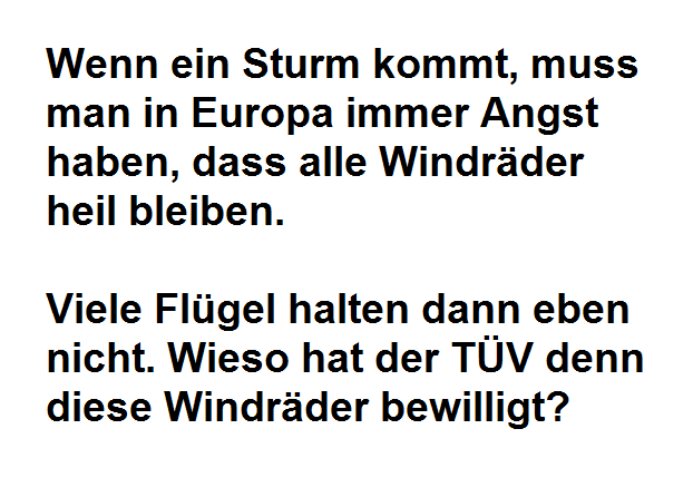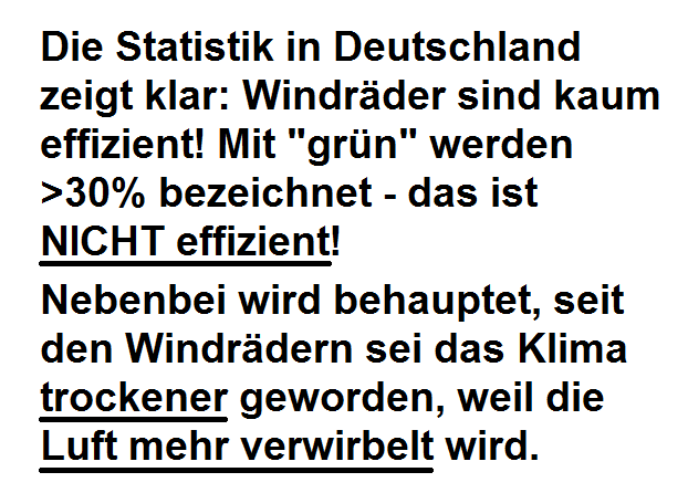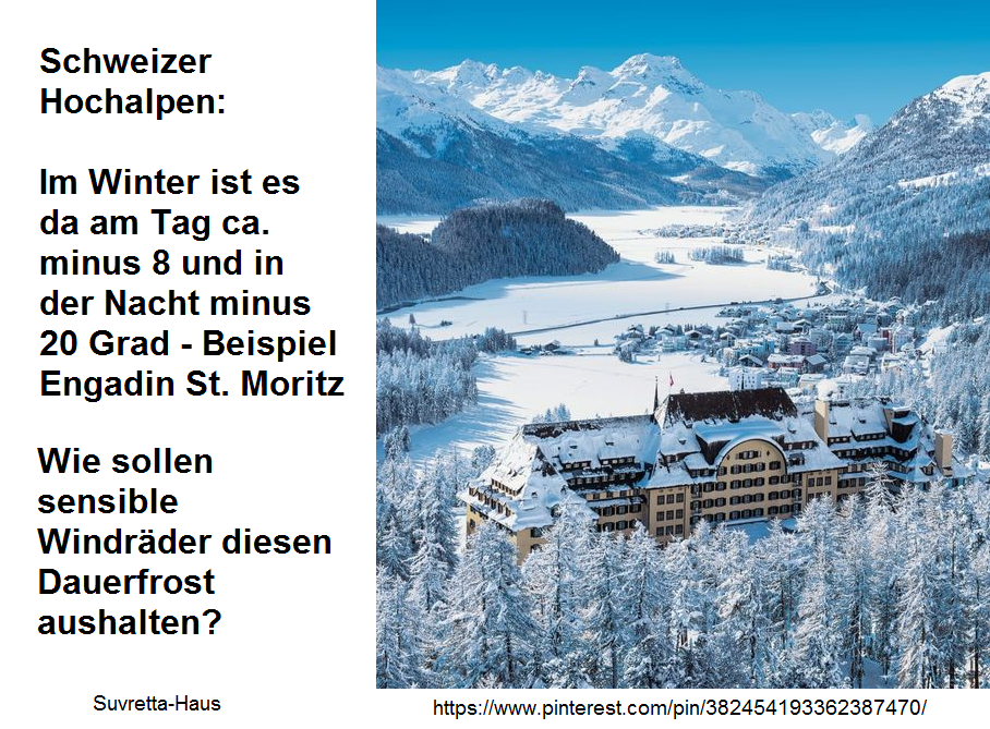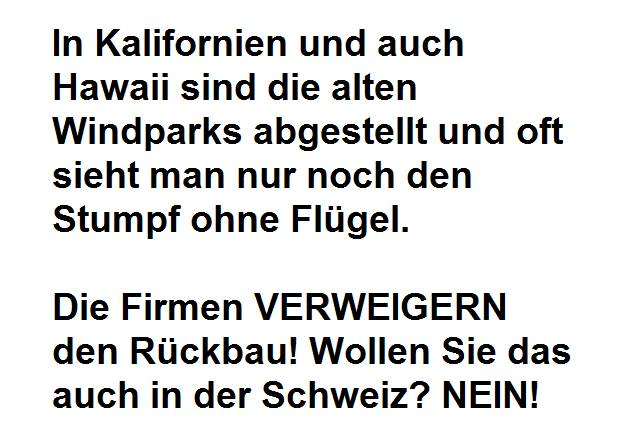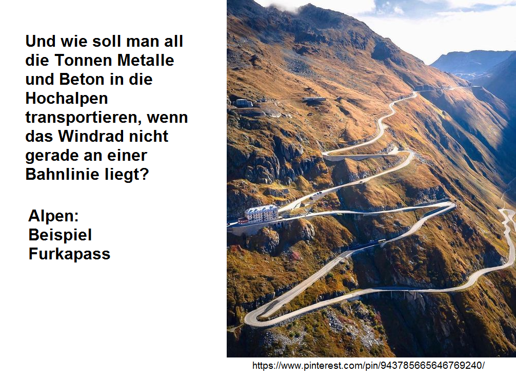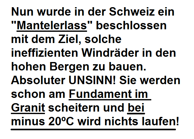 Windräder töten Vögel, Insekten, Windräder provozieren Infraschall und töten damit Tiere, Vieh und vertreiben die Bewohner wegen Kopfweh und dumpfem Dauerlärm. Ausserdem braucht das Fundament allein 400-500m3 Stahlbeton und der Bau braucht Stahl und seltene Erden, gar nicht umweltfreundlich. Bei Sturm kippen sie oder es brechen Flügel ab. Im Winter muss man sie mit Helikopter enteisen. Hochgebirge hat im Winter 3 Monate Dauerfrost bis minus 30 Grad, kann nicht funktionieren. Ein Fundament tief in den Granit der Alpen zu sprengen? Viel Spass! Im Wald wird der Wald zerstört und es fliehen die Waldtiere, weil sie das grosse Windrad als Raubvogel wahrnehmen. Im Meer verwirren sie Fische mit Schwingungen und die salzige Feuchtigkeit bringt die Windräder bei Stillstand zum Rosten, so dass sie mit Diesel betrieben werden müssen. Die Flügel der grossen Windräder kann man NICHT recyclen, sondern werden einfach vergraben. Die Firmen verweigern auch den Rückbau, und am Ende bleiben haufenweise Windräder in der Landschaft, die gar nicht mehr laufen, teilweise ohne Flügel.