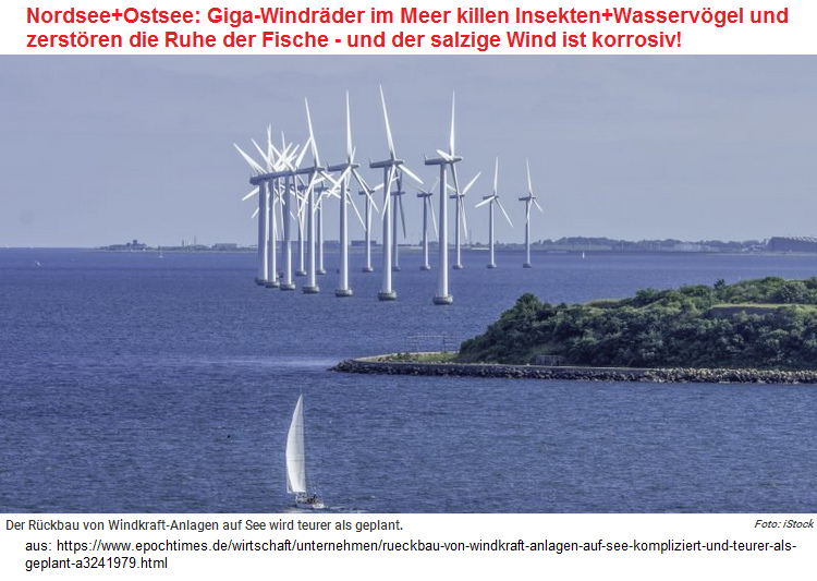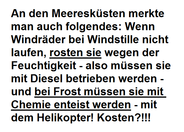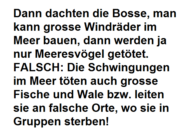 -- im Meer verwirren sie Fische mit Schwingungen und die salzige Feuchtigkeit bringt die Windräder bei Stillstand zum Rosten, es erfolgt Betrieb mit Diesel