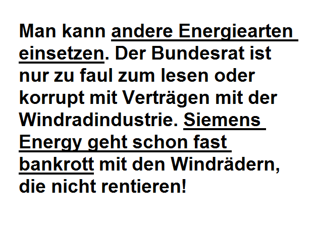 Man kann andere Energiearten einsetzen. Der Bundesrat ist nur zu faul zum lesen oder korrupt mit Verträgen mit der Windradindustrie. Siemens Energy geht schon fast bankrott mit den Windrädern, die nicht rentieren! [21]
