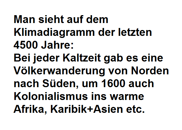 Bei jeder Kaltzeit gab es eine Völkerwanderung von Nordennach Süden, um 1600auch Kolonialismus ins Warme Afrika, Karibik + Asien etc. [24a]