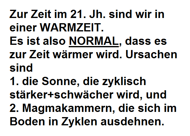 Zur Zeit im 21. Jh. sind wir in einer WARMZEIT. Es ist also NORMAL, dass es zur Zeit wärmer wird. Ursachen sind
