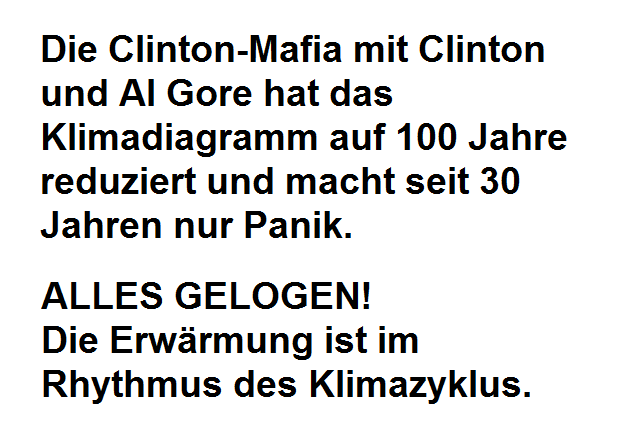 Die Clinton-Mafia mit Clinton und Al Gore hat das Klimadiagramm auf 100 Jahre reduziert und macht seit 30 Jahren nur Panik. ALLES GELOGEN!