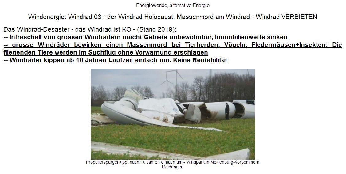 -- Grosse Windräder kippen nach 10 Jahren einfach um und sind unrentabel (Meldung 18.1.2017 / 26.5.2017 / 27.5.2018 / 12.3.2019 / 24.4.2019)