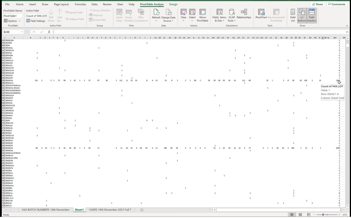 Here is a pivic [?] table which I made by combining the different tables from the VAERS data base (49''). On the left hand side we have the batch numbers, otherwise known as lot numbers (59'') for the Covid 19 vaccines (1'2''). And on the right hand side in this column we have the total number of adverse reactions for each batch (1'16''). So this is the total number of adverse reactions for each batch (1'21''). Along the top you can see the two-letter code for each of the states in the "United States" (1'30''). And what these columns show in between are the number of adverse reactions for a particular batch (1'42'') that occur in each state of the "USA" (1'46'').