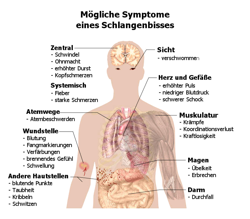 -- das Schema über Symptome nach Schlangenbissen zeigt generell auf: Die Giftwirkungen sind: Schwindel, Ohnmacht, erhöhter Durst, Kopfschmerzen, Augenschaden mit verschwommener Sicht, Fieber, Schmerzen überall, Herzrasen / erhöhter Puls, Blutdruck spielt Achterbahn, schwerer Schock in den Blutgefässen, Krämpfe, Koordinationsverlust, Kraftlosigkeit, Atemprobleme / Atembeschwerden, Übelkeit, Erbrechen, Durchfall, Taubheit, Kribbeln, Schwitzen, an der Bissstelle: Blutung, Fangmarkierungen, Verfärbung, brennendes Gefühl, Schwellung [web02]