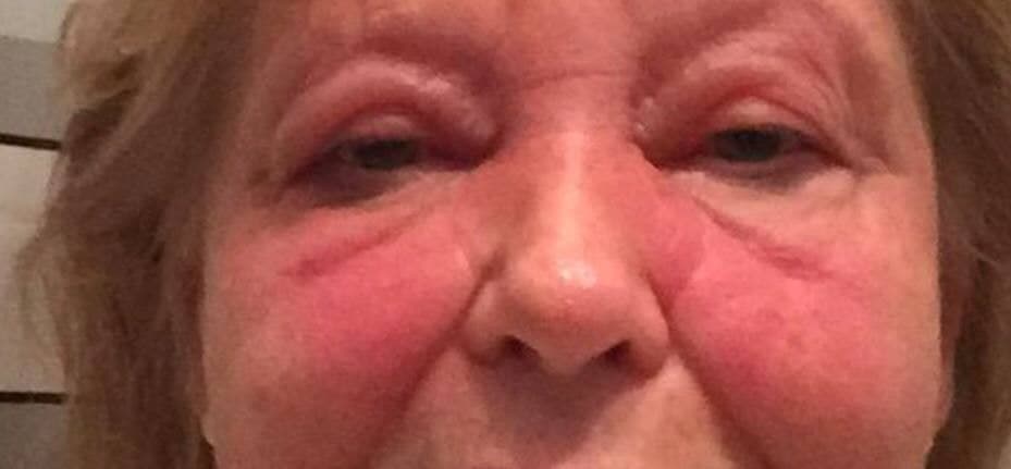 am 7.6.2021: Violette Flecken am Bein und im Gesicht
