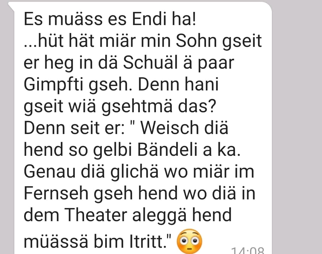 (orig.: Es muäss es Endi ha! ... hüt hät mi¨r min Sohn gseit er heg in dä Schuäl ä paar Gimpfti gseh. Denn hani gseit wiä gsehtmä das? Denn seit er: "Weisch diä hend so gelbi Bändlei a ka. Denau diä glichä wo miär im Fernseh gseh hend wo diä in dem Theater akleggä hend müässä bim Itritt.")