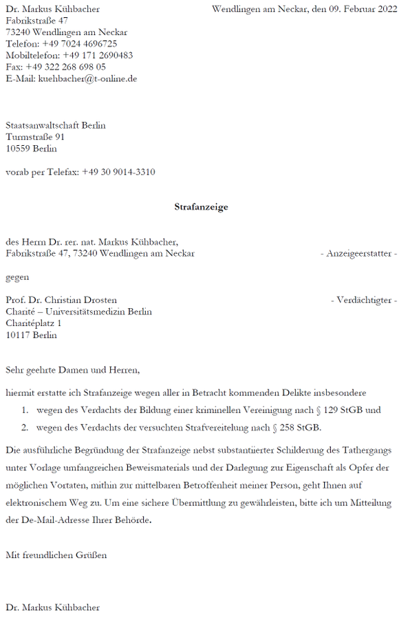Der auf Wissenschaftsbetrug spezialisierte Wissenschaftler Dr. Markus Kühbacher gab via Twitter bekannt, Strafanzeige gegen Prof. Christian Drosten gestellt zu haben.