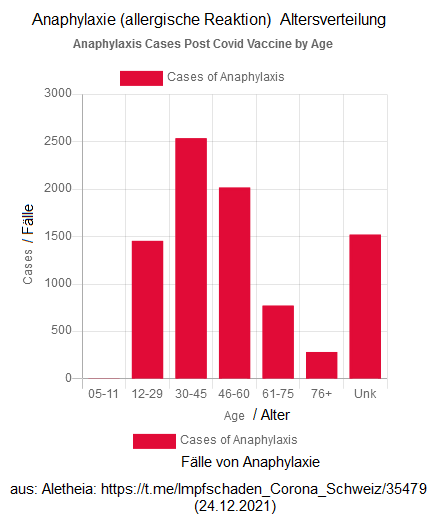 Zahlen GENimpfschäden bei VAERS ("USA") 24.12.2021: Bei Anaphylaxie (allergische Reaktion) ist die Altersgruppe zwischen 30 bis 60 am meisten betroffen