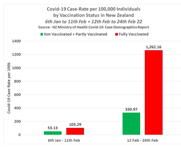 Das folgende Diagramm zeigt die reale Leistung des Immunsystems der vollständig geimpften Bevölkerung in Neuseeland zwischen dem 6. Januar und dem 11. Februar sowie zwischen dem 12. Februar und dem 24. Februar 22 im Vergleich zur Leistung des Immunsystems der ungeimpften Bevölkerung.