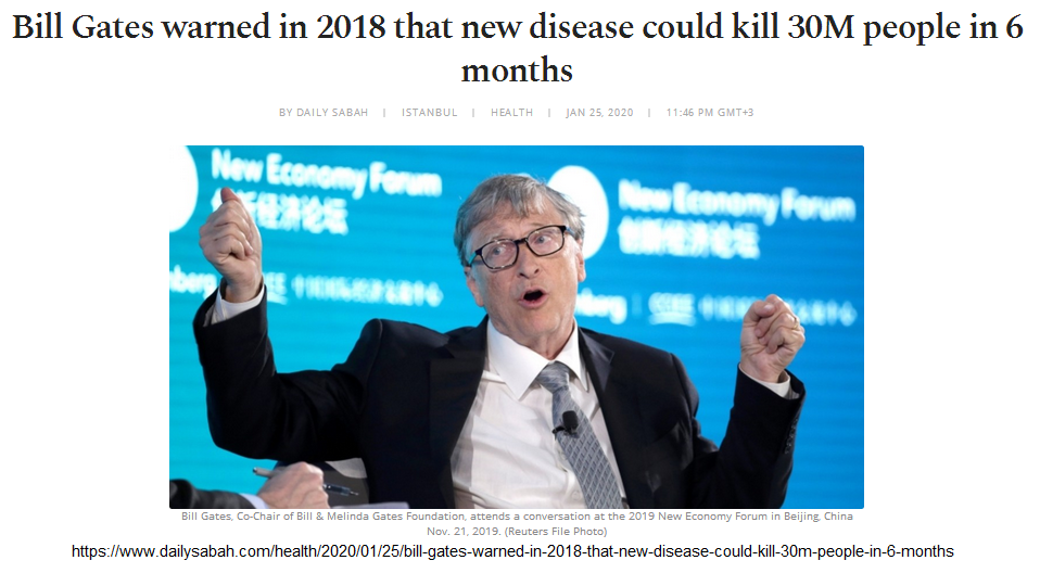 [5]--- da prophezeite der Impf-Guru Bill Gates im Jahre 2018 für den "nächsten Erreger" 30 Millionen Tote, sein Wunschdenken, um neue Impfungen zu verkaufen (https://www.dailysabah.com/health/2020/01/25/bill-gates-warned-in-2018-that-new-disease-could-kill-30m-people-in-6-months),