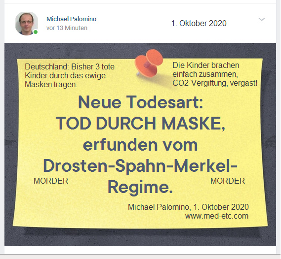 Neue Todesart TOD DURCH MASKE, erfunden vom Drosten-Spahn-Merkel-Regime - die Kinder sterben an CO2-Vergiftung - und die Kindermörder laufen frei herum - registriert am 1.10.2020