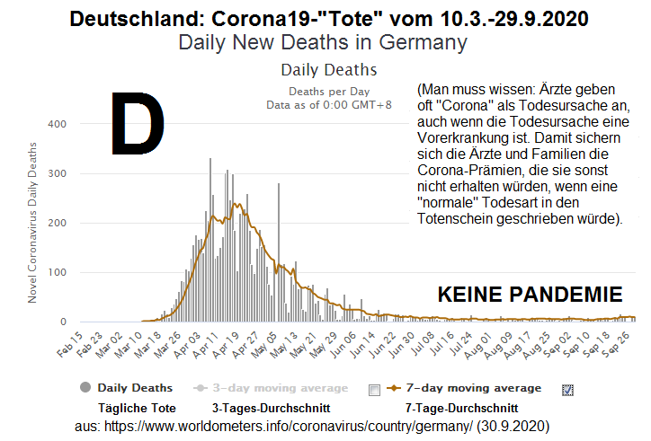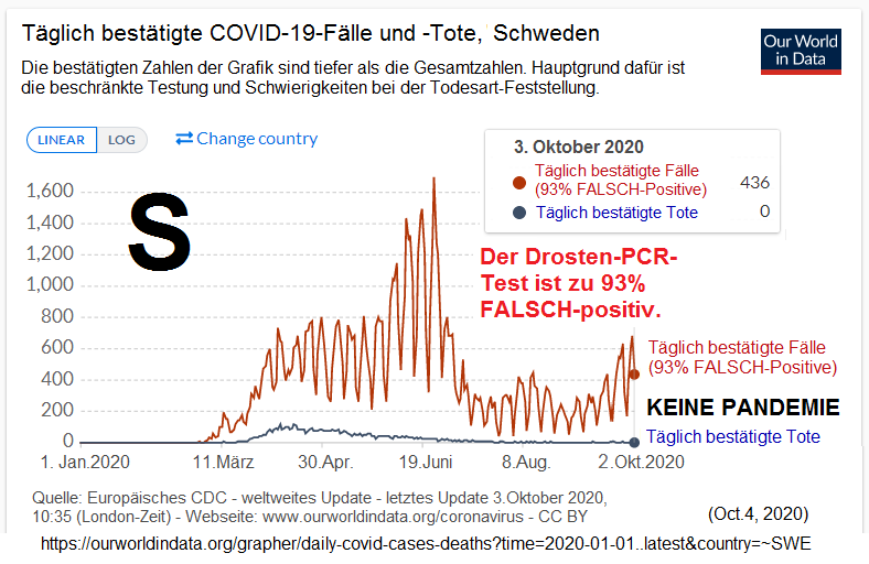 [14] Schweden: Corona19-Tote vom 10. März bis 2.10.2020: KEINE Pandemie vorhanden: www.worldometers.info -> coronavirus -> Sweden