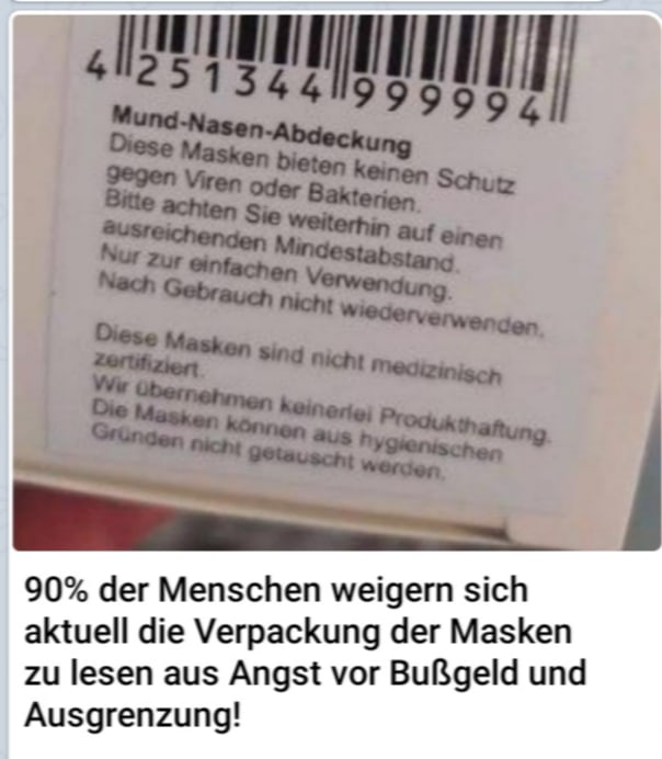 [1] Masken-Beipackzettel: Warnung: Kein Schutz vor Bakterien oder Viren: