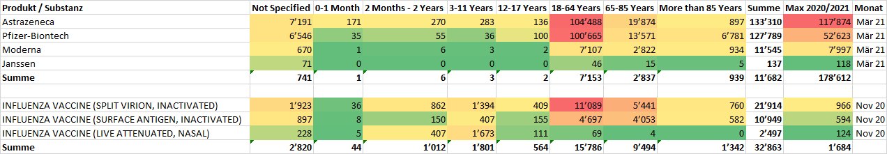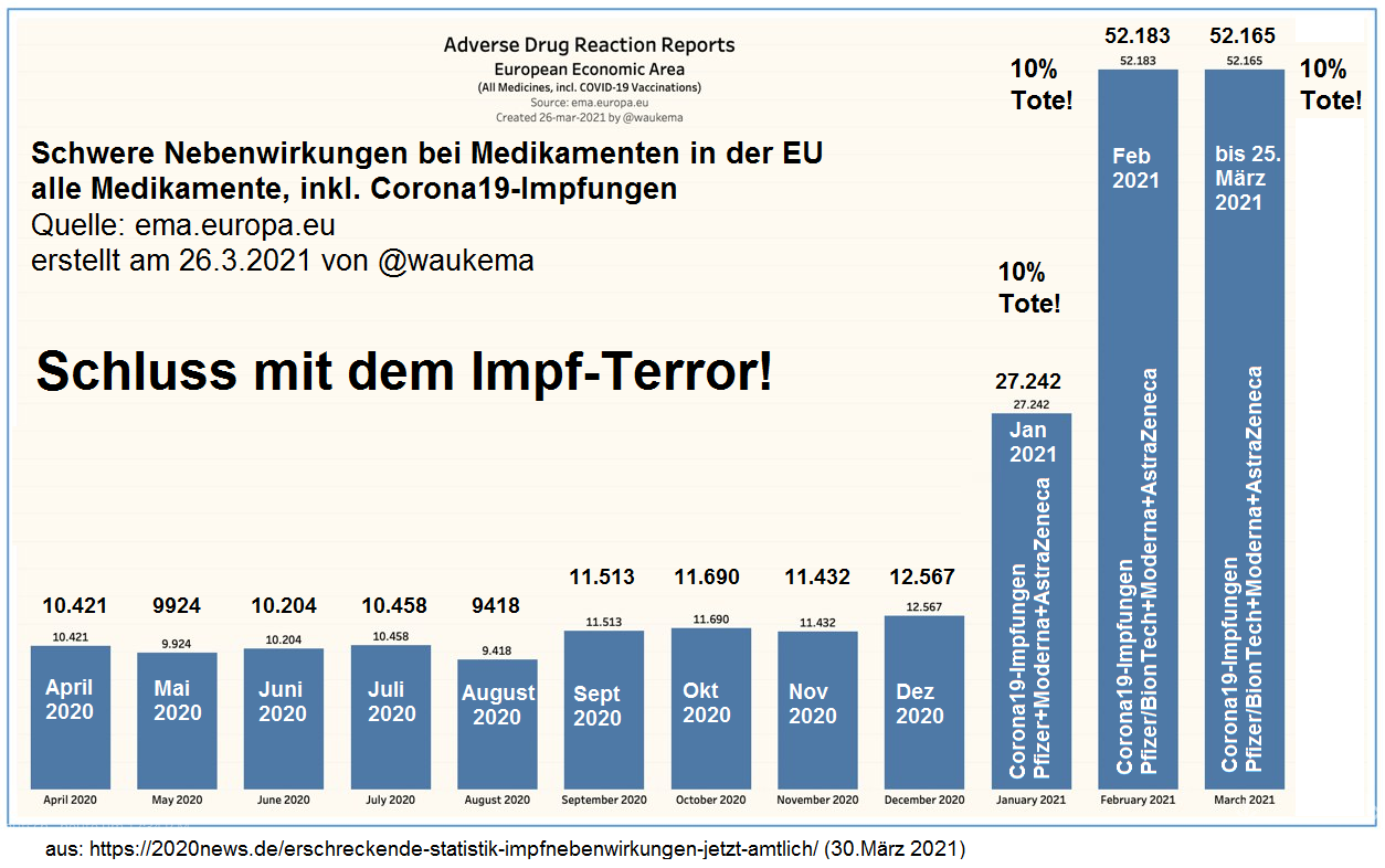 [9] Tabelle 3.4.2021: Schwere Nebenwirkungen bei Arzneimitteln (kr. Pharma-EU): Genspritze von Pfizer/BionTech+Affenspritze von AstraZeneca: Verdachtsfälle von Arzneimittelnebenwirkungen (EU)