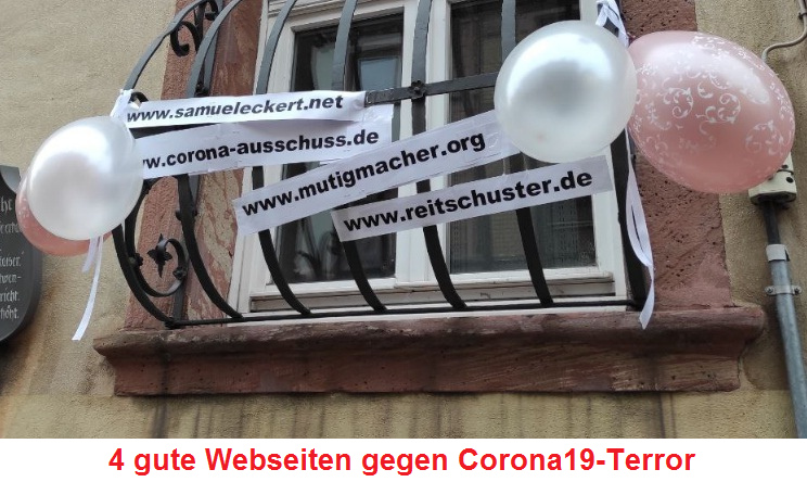 4 gute Webseiten gegen Corona19-Terror: www.samueleckert.net -- www.corona-ausschuss.de -- www.mutigmacher.org -- www.reitschuster.de