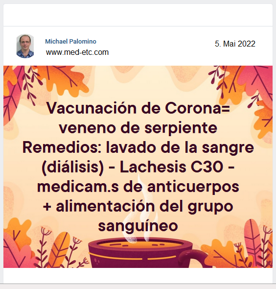 Entonces podría ser también que se puede CURAR la gente afectada por vacunas de Corona con curas contra el veneno de serpientes: "antisuero", remedios homeopáticos para picaduras de serpientes como Lachesis u Ofiophagus Hannah (cobra del rey) o medicamentos de anticuerpos contra veneno de serpiente, o se organiza un lavado de la sangre (diálisis) que también mejora la vida después de una inyección con veneno de serpiente - además sale eliminación de los metales (óxido de grafeno, etc.) con preparaciones de algas, etc.