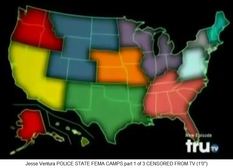 Jesse Ventura y Alex Jones [80] - Mapa de los "Estados Unidos" con 10 distritos carcelarios [1] - Campos de concentración "Estados Unidos" 2010 [2] - Decisión legislativa sobre la construcción de campos de concentración No. H.R.645 (22-2-2002) [3]