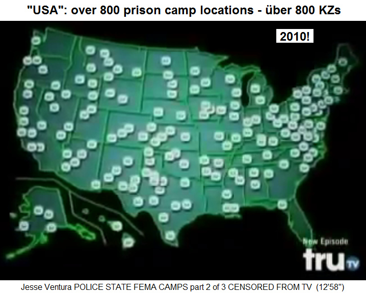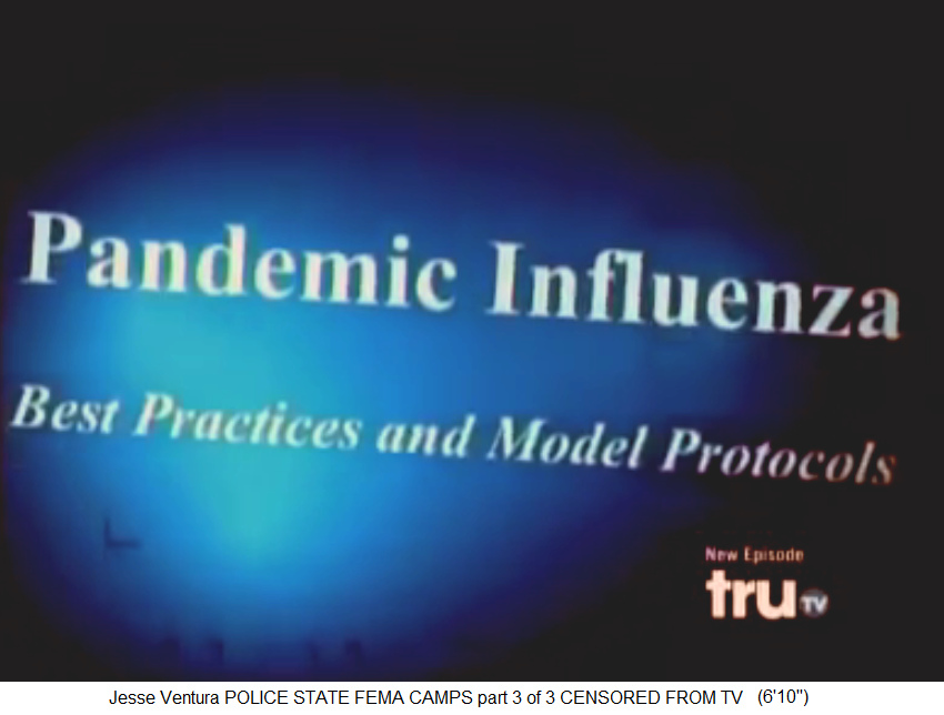 Jesse Ventura informa sobre centros de fusión (Fusion Centers), difamaciones (desde 2001), construcción de campos de concentración (cc) con la resolución de ley H.R.645 (2002), escenarios pandemia proyectada (desde 2007), almacenamiento de ataúdes, "EUA" = 10 zonas carcelarias (2010)