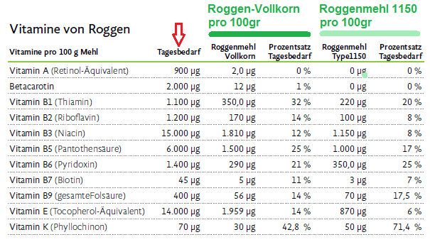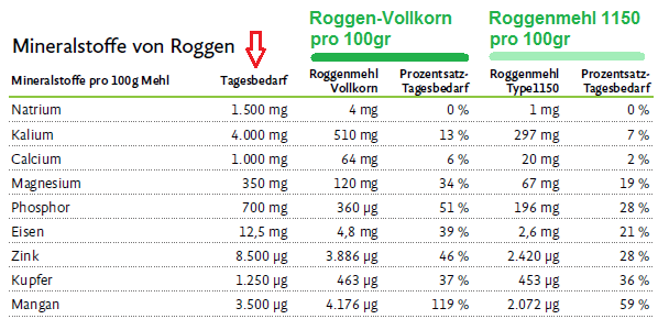 -- Roggenmehle sind verschieden: Vollkornroggenmehl und Roggenbackschrot mit der kompletten Schale haben am meisten Vitamine, Mineralien etc. [web04]