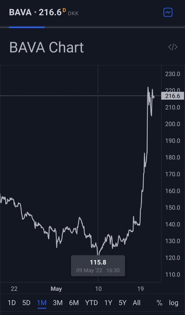 Das Unternehmen Bavarian Nordic, das hinter dem Affenpockenimpfstoff Jynneos steht, schießt derzeit an der Börse in die Höhe. Der Kurs ist seit dem 9. Mai von 115 auf 216 gestiegen, während der Rest des Marktes abstürzt. Der sprunghafte Anstieg des Aktienkurses und des Marktvolumens vor der Bestellung von 13 Millionen Impfdosen durch die US-Regierung deutet auf Insiderhandel und eine Plandemie hin.