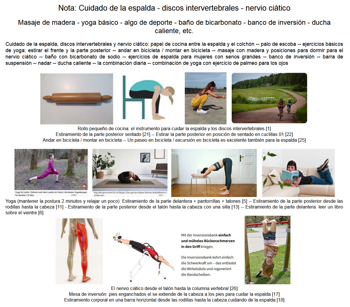 Cuidado de la espalda, discos intervertebrales y nervio ciático: papel de cocina entre la espalda y el colchón -- palo de escoba -- ejercicios básicos de yoga: estirar el frente y la parte posterior -- andar en bicicleta / montar en bicicleta -- masaje con madera y posiciones para dormir para el nervio ciático -- baño con bicarbonato de sodio -- ejercicios de espalda para mujeres con senos grandes -- banco de inversión -- barra de suspensión -- nadar -- ducha caliente -- la combinación diaria -- combinación de yoga con ejercicio de palmeo para los ojos