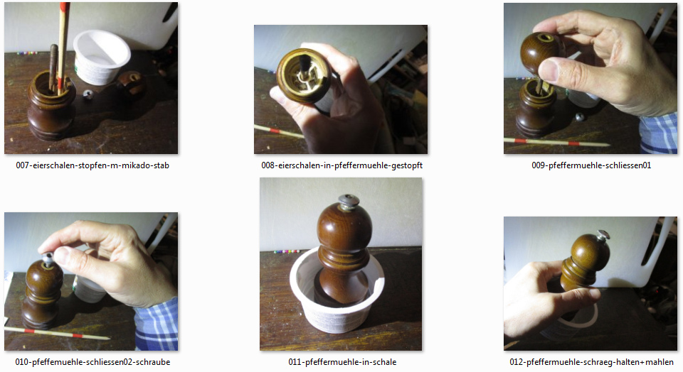 Sammelfoto 01: Zerbröselte Eierschalen werden in eine kleine Pfeffermühle gefüllt [3]
