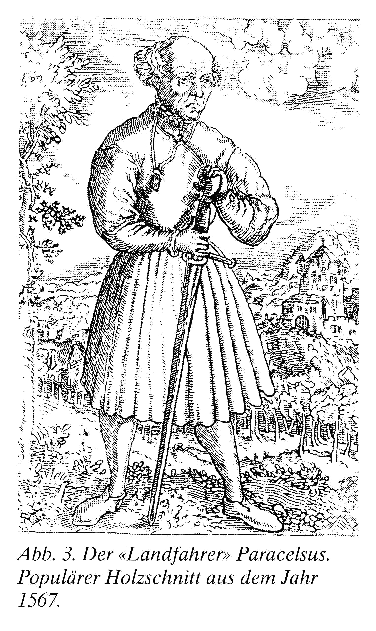 vergrössernDer "Landfahrer" Paracelsus. Populärer Holzschnitt 1567 (28 Jahre nach seinem Tod 1541).