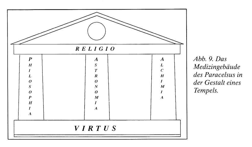 Alchimie. vergrössern Das medizinale Paracelsus-Prinzip der drei Säulen: Philosophie, Astronomie, Alchimie, in Form eines Tempels.